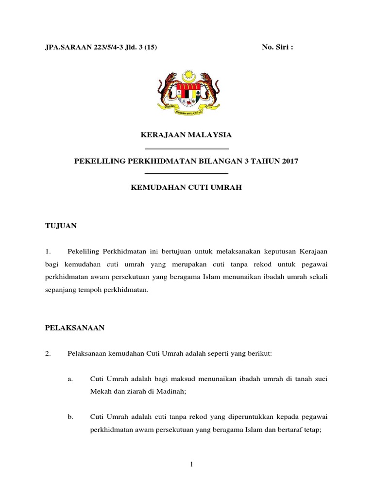 Secara ringkasnya pekeliling ini menjelaskan tentang cuti umrah dimana ianya merupakan cuti tanpa rekod untuk pegawai perkhidmatan awam persekutuan yang beragama Islam menunaikan ibadah. Pekeliling Cuti Tanpa Rekod Menduduki Peperiksaan. Cuti Urusan Kematian Ahli Keluarga Terdekat 17.
